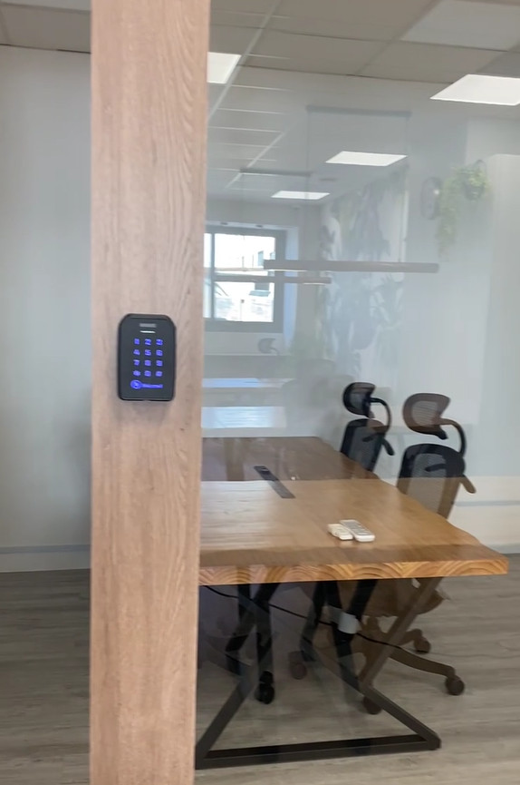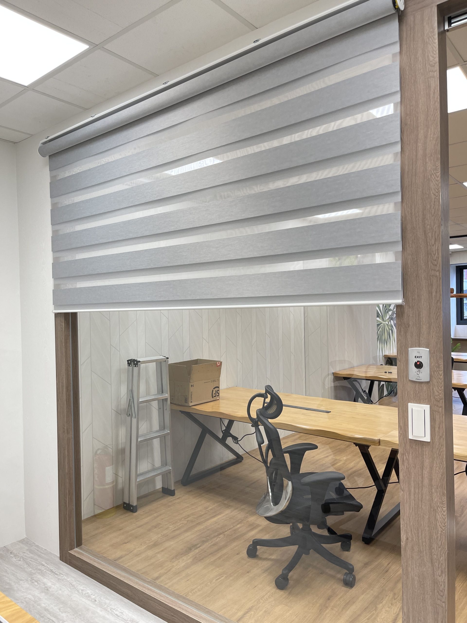 502號辦公室為四人專屬空間,設有獨立空調與門鎖,確保舒適與安全。辦公室面向開放座位區,擁有寬敞視野,同時配備獨立電動門簾,在共享環境中也能兼顧隱私。