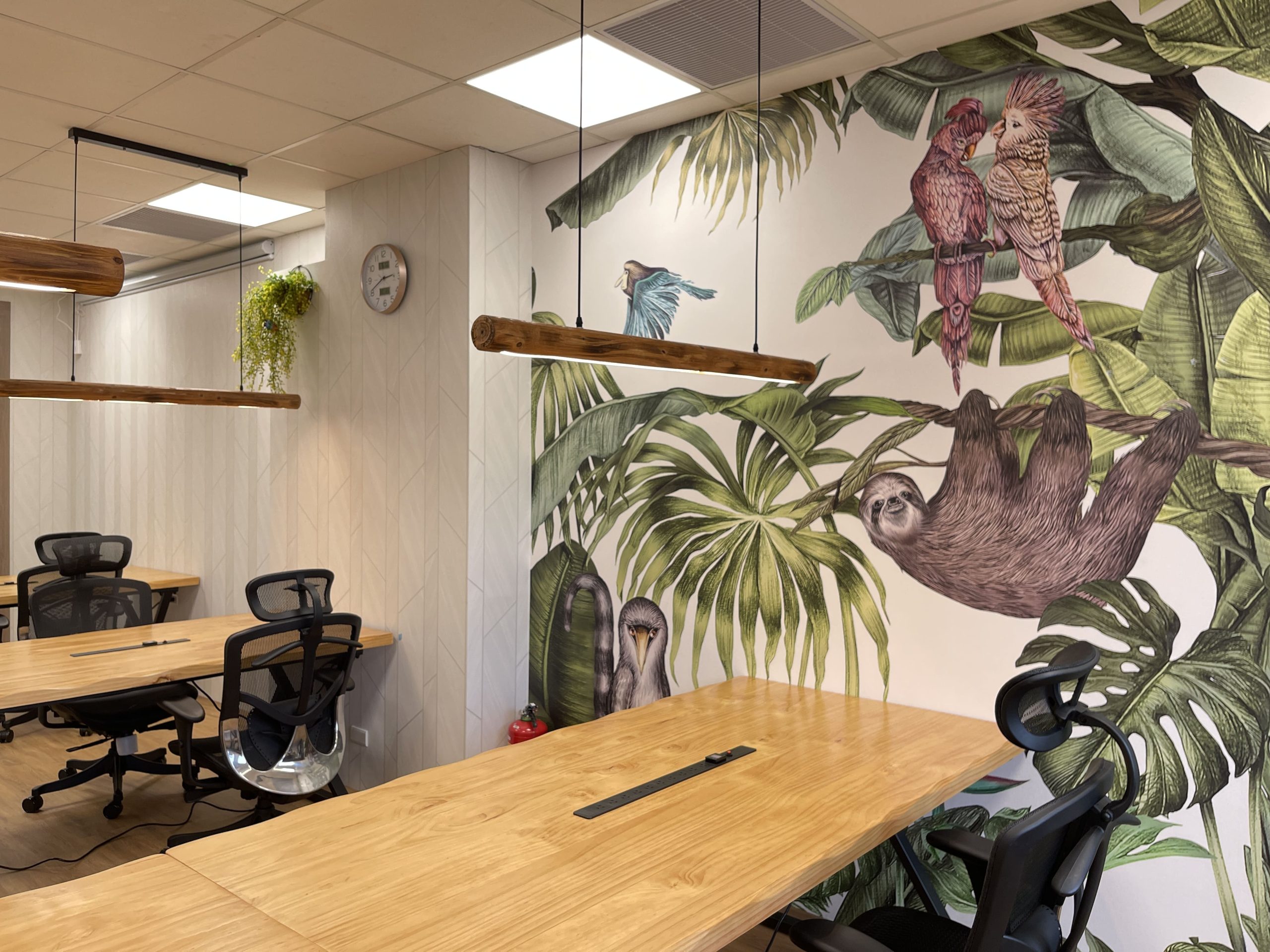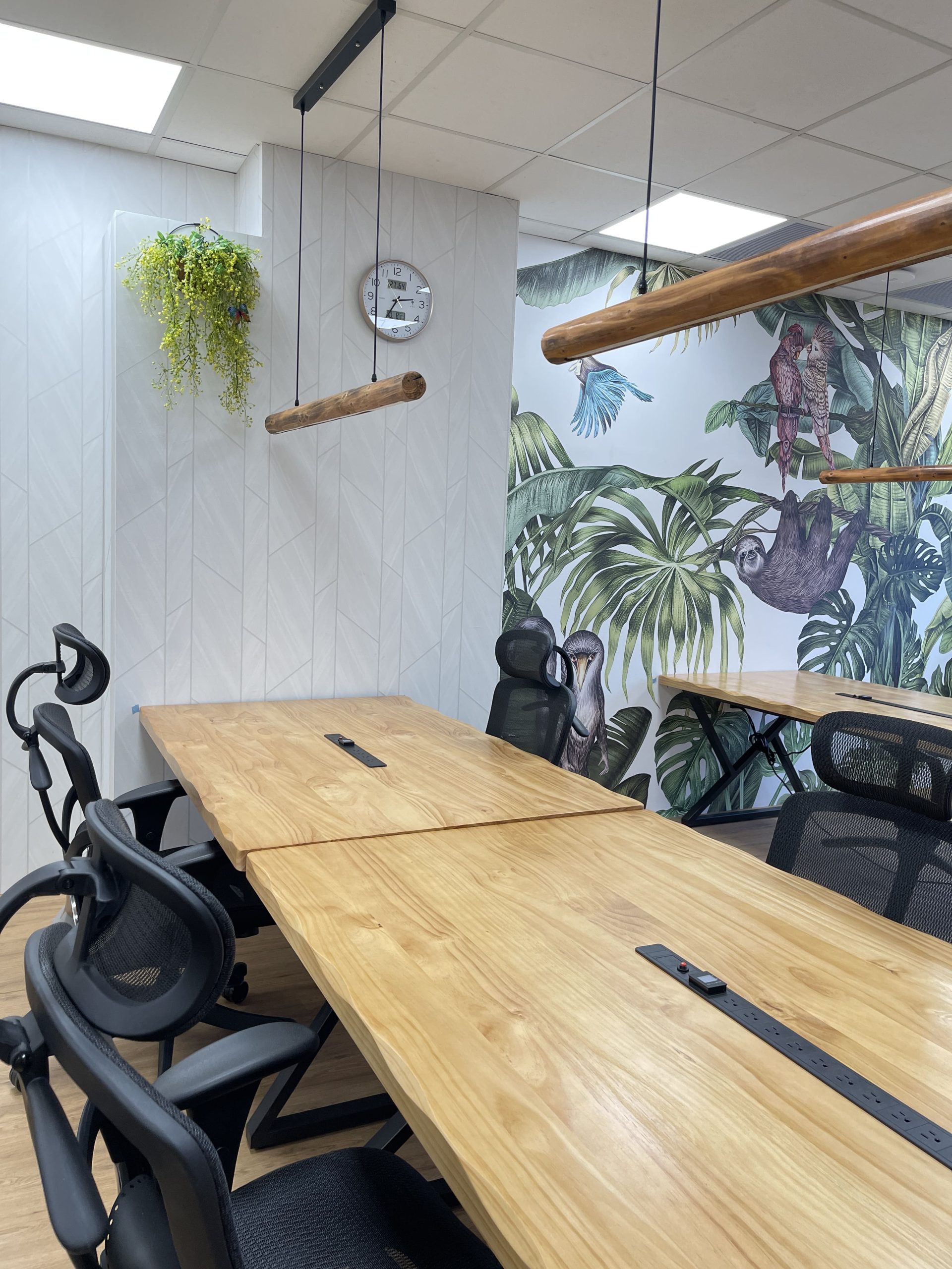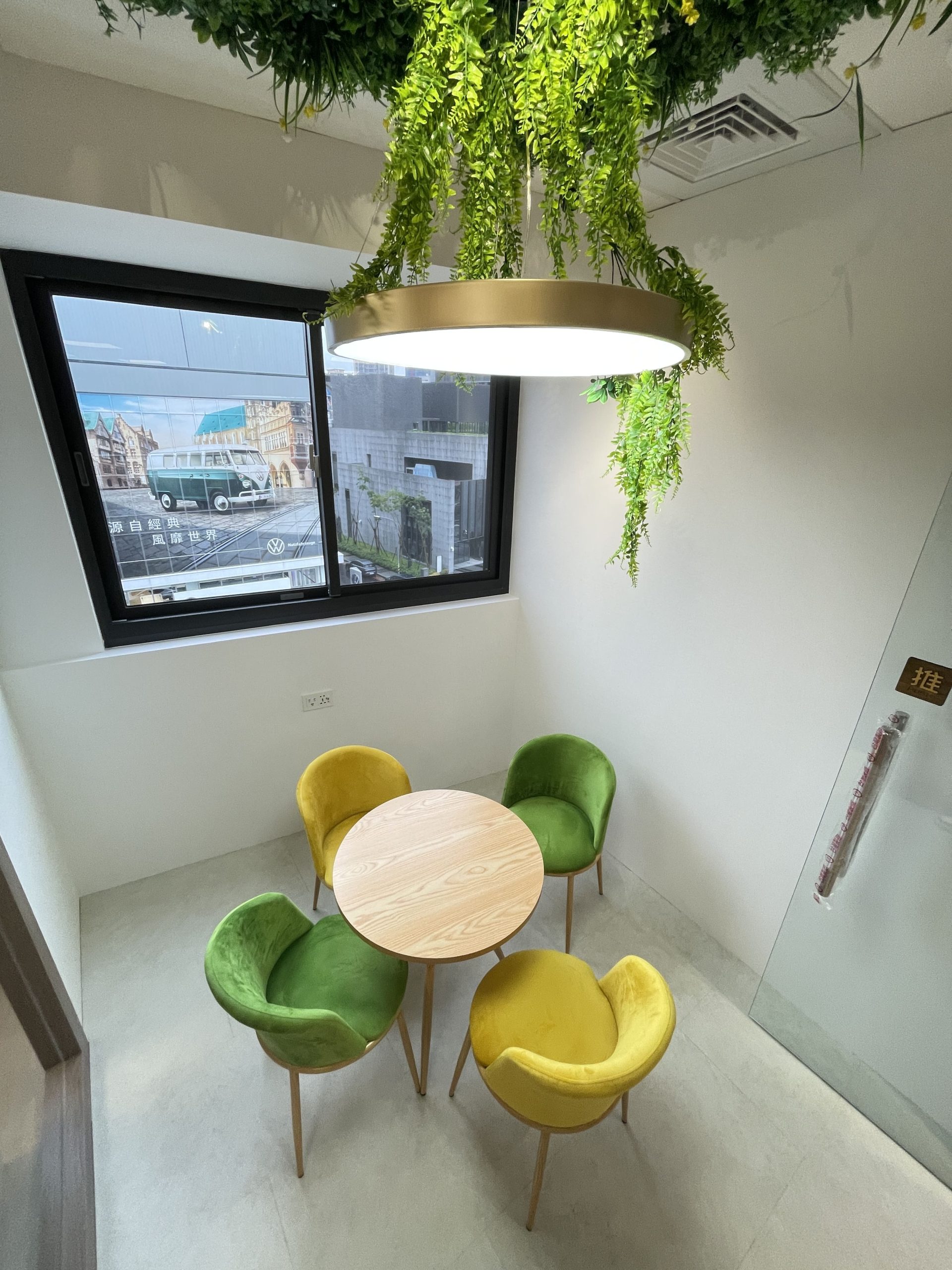這是一間充滿熱帶雨林氛圍的開放空間,設計風格自然清新,讓人彷彿置身大自然的懷抱。原木桌子散發著淡雅木香,是老闆親自從海外精挑細選而來,為整體環境增添了質樸溫暖的氣息。空間採光極佳,白天陽光充足,而夜晚則透過別緻的吊燈照明,光線柔和而明亮。