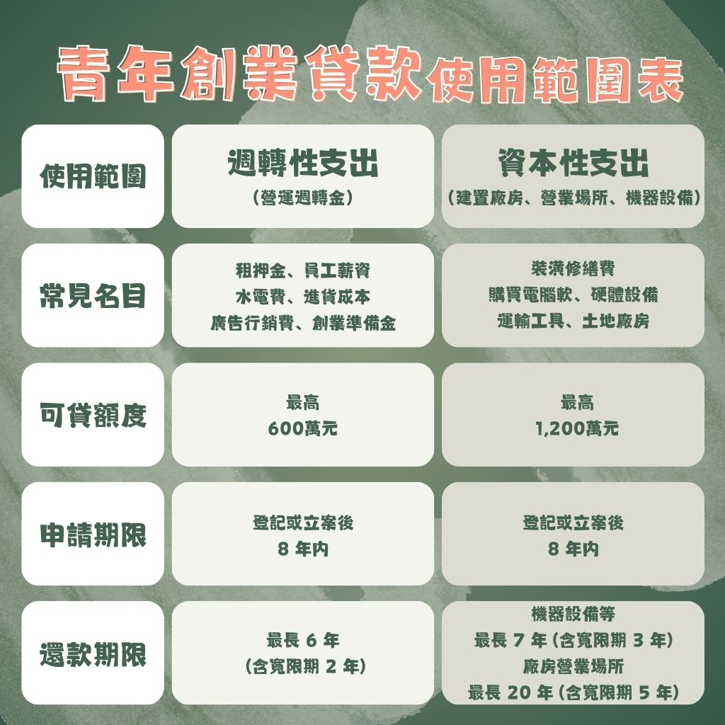 根據最新法規,原本獨立的「準備金」項目已合併至「週轉性支出」中,且整體額度與年限皆有大幅調整,讓資金運用更靈活。先看看整理好的青年創業貸款使用範圍表格吧~